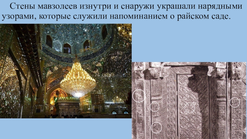 Слайд 15 Стены мавзолеев изнутри и снаружи украшали нарядными узорами,