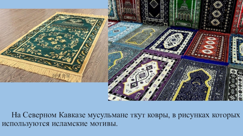 Слайд 21 На Северном Кавказе мусульмане ткут ковры, в рисунках