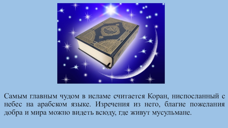 Самым главным чудом в исламе считается Коран, ниспосланный с небес на