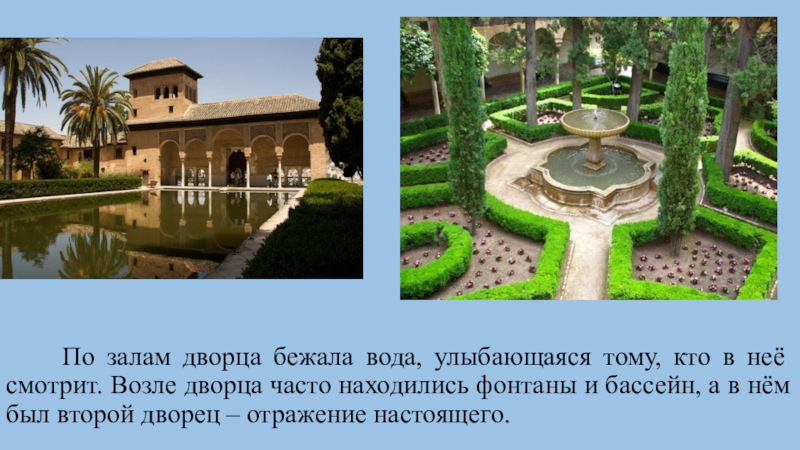 в неё смотрит. Возле дворца часто находились фонтаны и бассейн, а в нём был второй дворец – отражение настоящего.