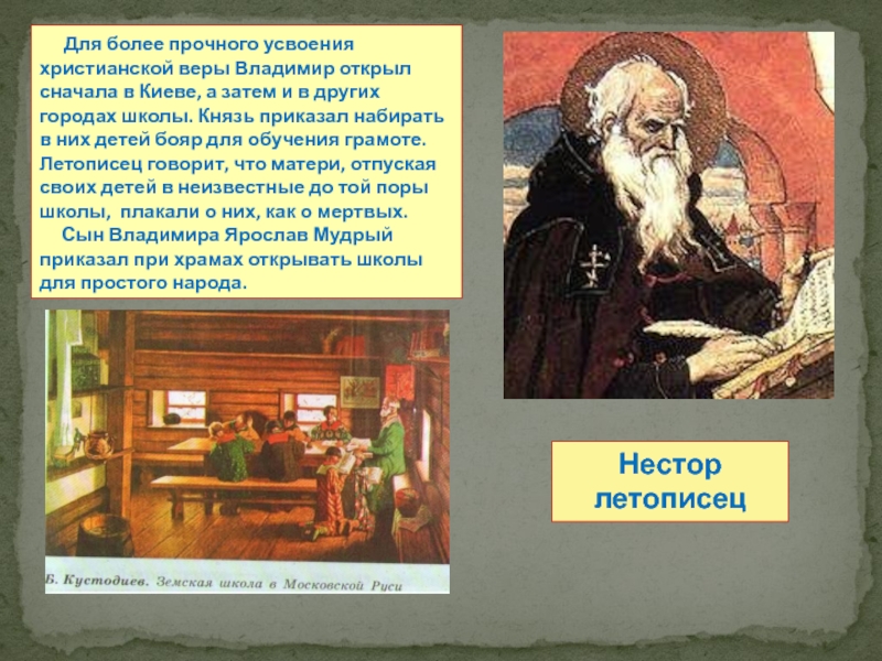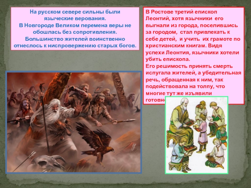 В Ростове третий епископ Леонтий, хотя язычники его выгнали из города, поселившись за городом, стал привлекать к себе детей, и учить их грамоте по христианским книгам. Видя успехи Леонтия, язычники хотели убить епископа.