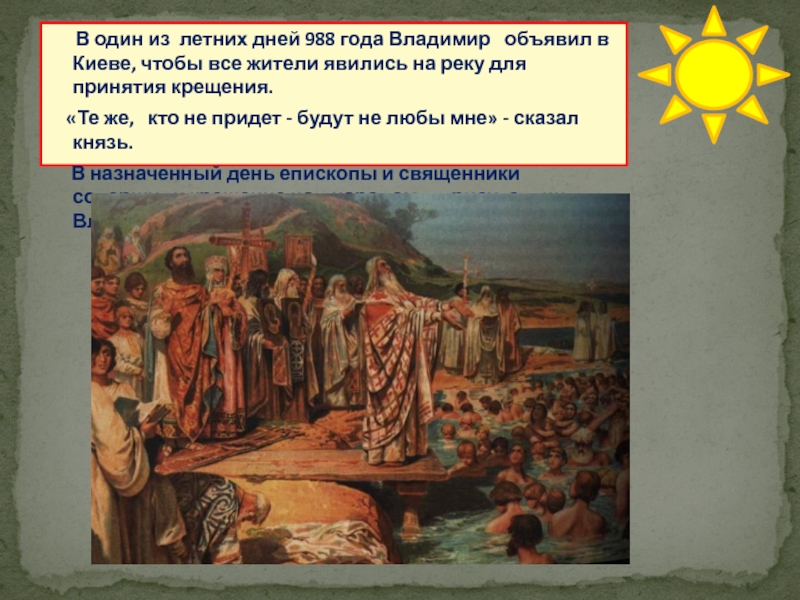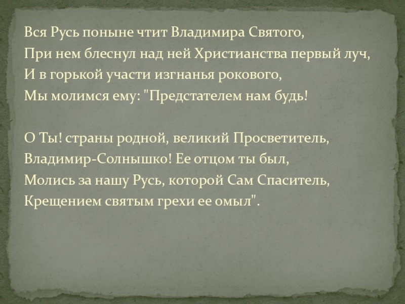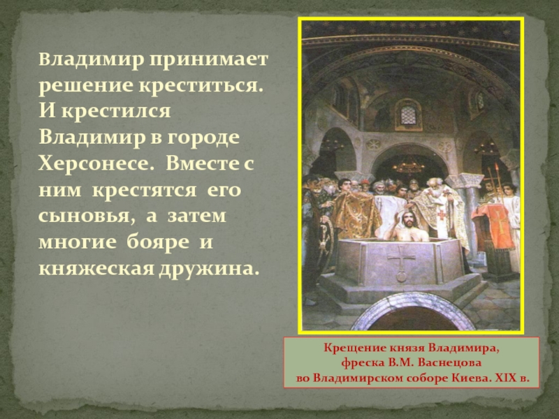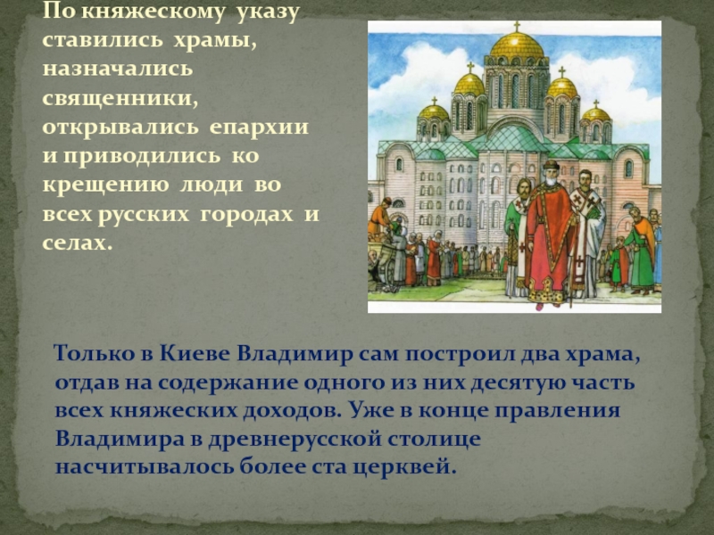 Только в Киеве Владимир сам построил два храма, отдав на содержание одного из них десятую часть всех княжеских доходов. Уже в конце правления Владимира в древнерусской столице насчитывалось более ста церквей.