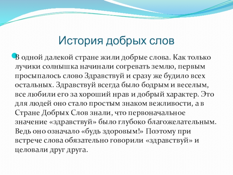 лучики солнышка начинали согревать землю, первым просыпалось слово Здравствуй и сразу же будило всех остальных. Здравствуй всегда было бодрым и веселым, все любили его за хороший нрав и добрый характер. Это для людей оно стало простым знаком вежливости, а в Стране Добрых Слов знали, что первоначальное значение «здравствуй» было глубоко благожелательным. Ведь оно означало «будь здоровым!» Поэтому при встрече слова обязательно говорили «здравствуй» и целовали друг друга.