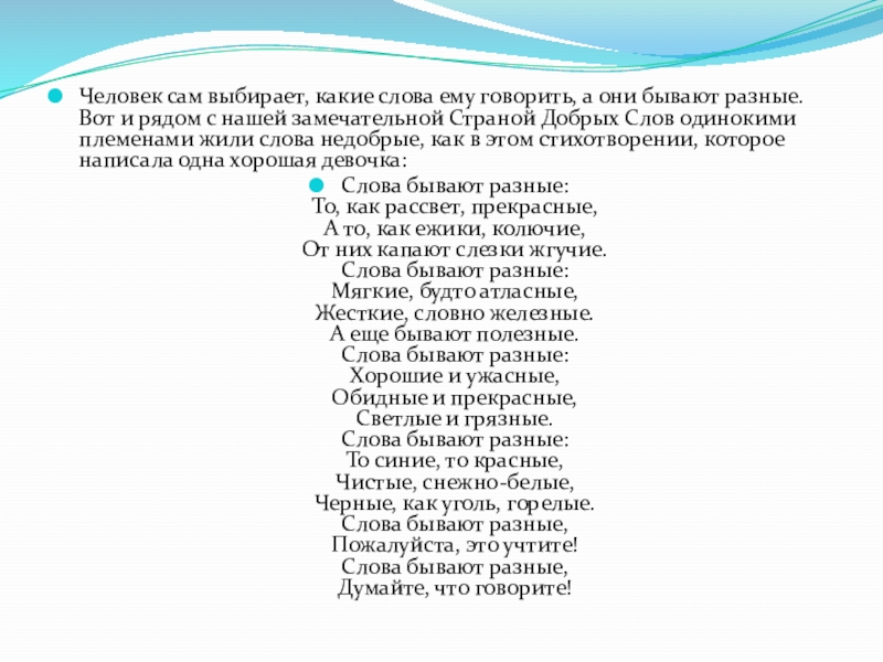 Слайд 17Человек сам выбирает, какие слова ему говорить, а они бывают разные.