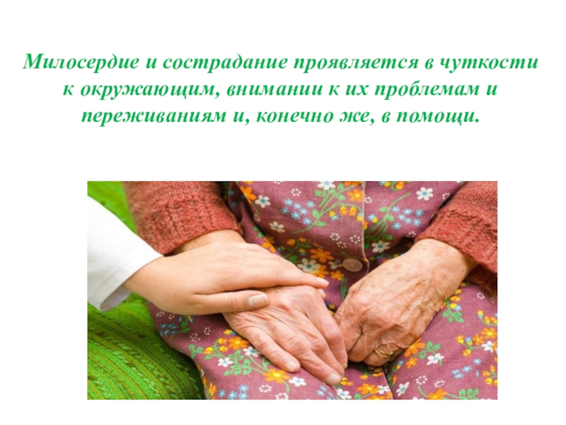 Слайд 10Милосердие и сострадание проявляется в чуткости к окружающим, внимании к их
