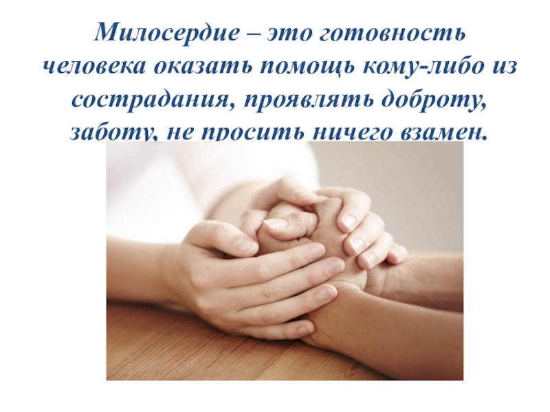Слайд 2Милосердие – это готовность человека оказать помощь кому-либо из сострадания, проявлять
