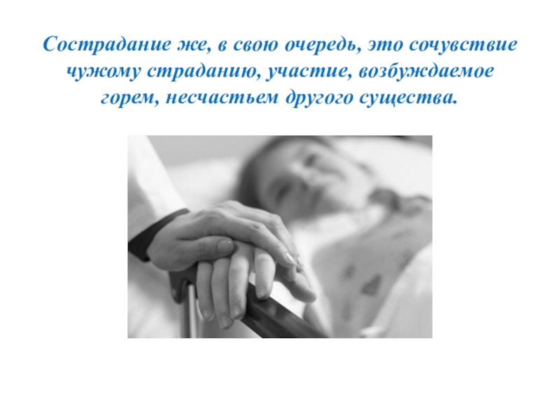 Слайд 5Сострадание же, в свою очередь, это сочувствие чужому страданию, участие, возбуждаемое