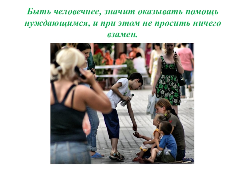 Слайд 8Быть человечнее, значит оказывать помощь нуждающимся, и при этом не просить