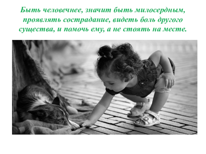 Слайд 9Быть человечнее, значит быть милосердным, проявлять сострадание, видеть боль другого существа,