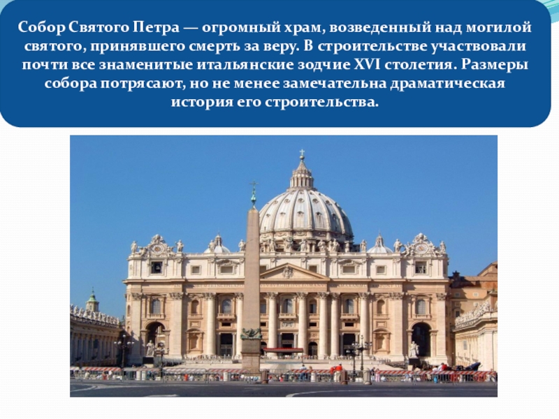 Слайд 5Собор Святого Петра — огромный храм, возведенный над могилой святого, принявшего