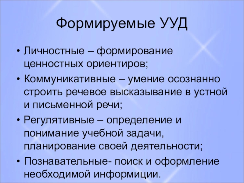 Коммуникативные – умение осознанно строить речевое высказывание в устной и письменной речи;
