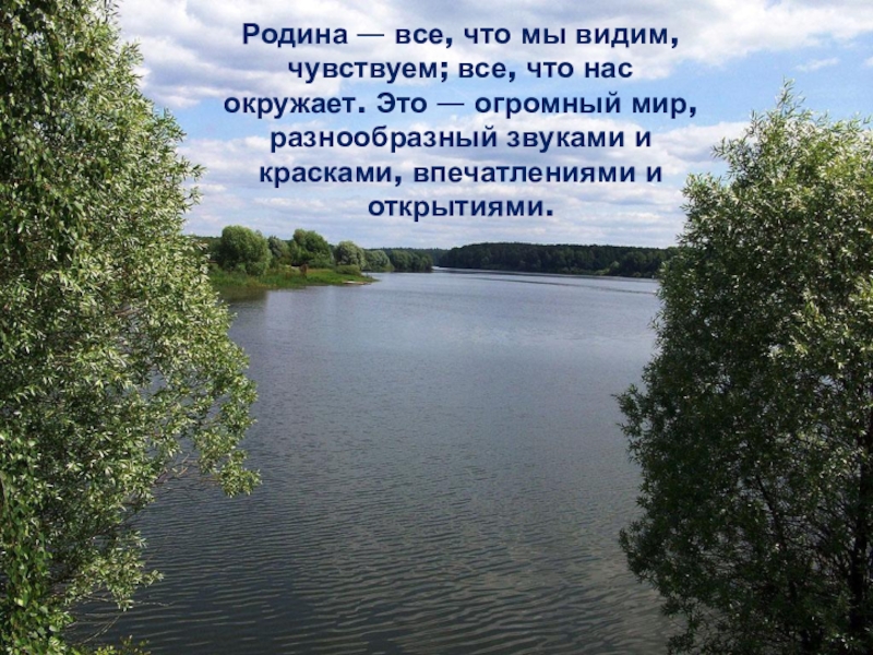 Родина — все, что мы видим, чувствуем; все, что нас окружает. Это — огромный мир, разнообразный звуками и красками, впечатлениями и открытиями.