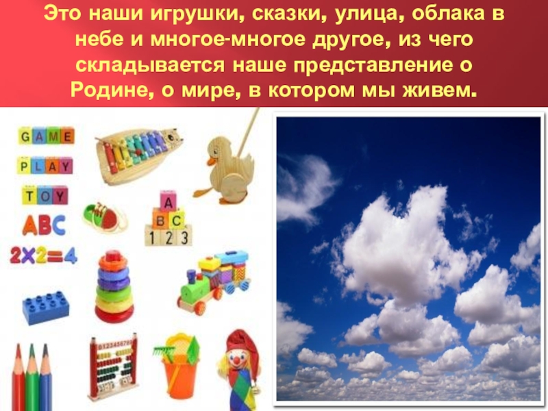 Слайд 9Это наши игрушки, сказки, улица, облака в небе и многое-многое другое,