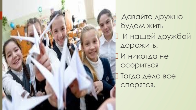 Давайте дружно будем жить И нашей дружбой дорожить.И никогда не ссоритьсяТогда дела все спорятся.
