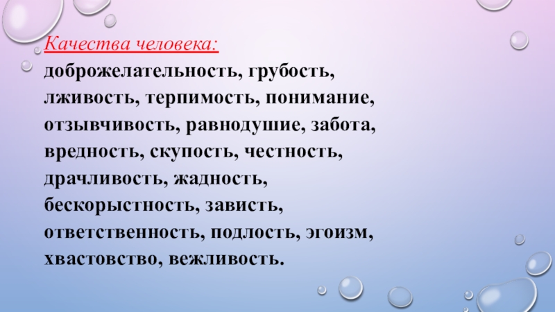 Качества человека: доброжелательность, грубость, лживость, терпимость, понимание, отзывчивость, равнодушие, забота, вредность, скупость, честность, драчливость, жадность, бескорыстность, зависть,