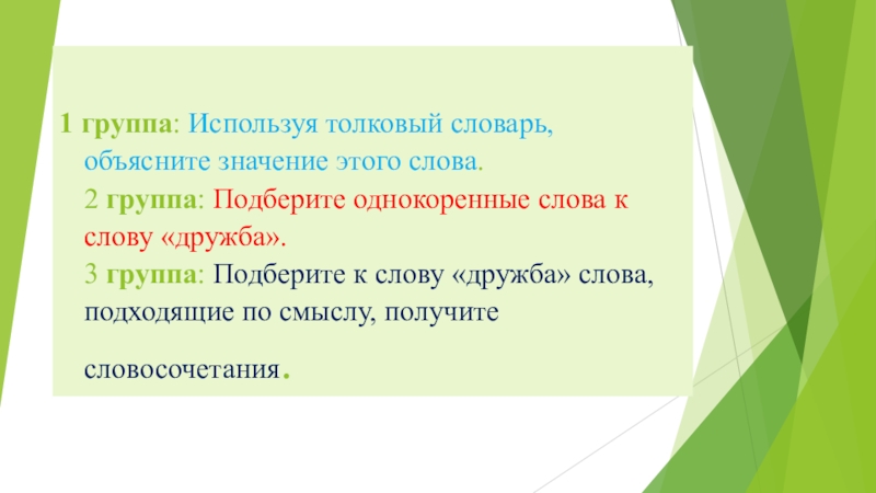 1 группа: Используя толковый словарь, объясните значение этого слова. 2 группа: Подберите однокоренные слова к слову «дружба». 3 группа: Подберите к слову «дружба» слова, подходящие по смыслу, получите словосочетания.
