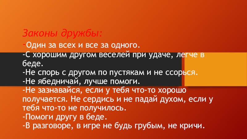 Законы дружбы: -Один за всех и все за одного. -С хорошим другом веселей при удаче, легче в
