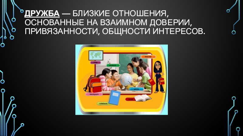 Слайд 3Дружба — близкие отношения, основанные на взаимном доверии, привязанности, общности интересов.