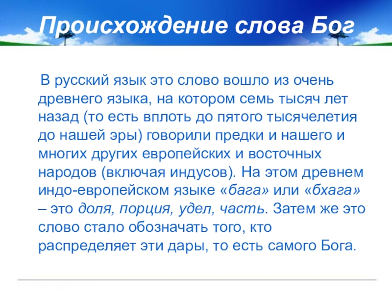 очень древнего языка, на котором семь тысяч лет назад (то есть вплоть до пятого тысячелетия до нашей эры) говорили предки и нашего и многих других европейских и восточных народов (включая индусов). На этом древнем индо-европейском языке «бага» или «бхага» – это доля, порция, удел, часть. Затем же это слово стало обозначать того, кто распределяет эти дары, то есть самого Бога.