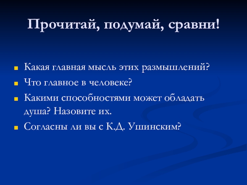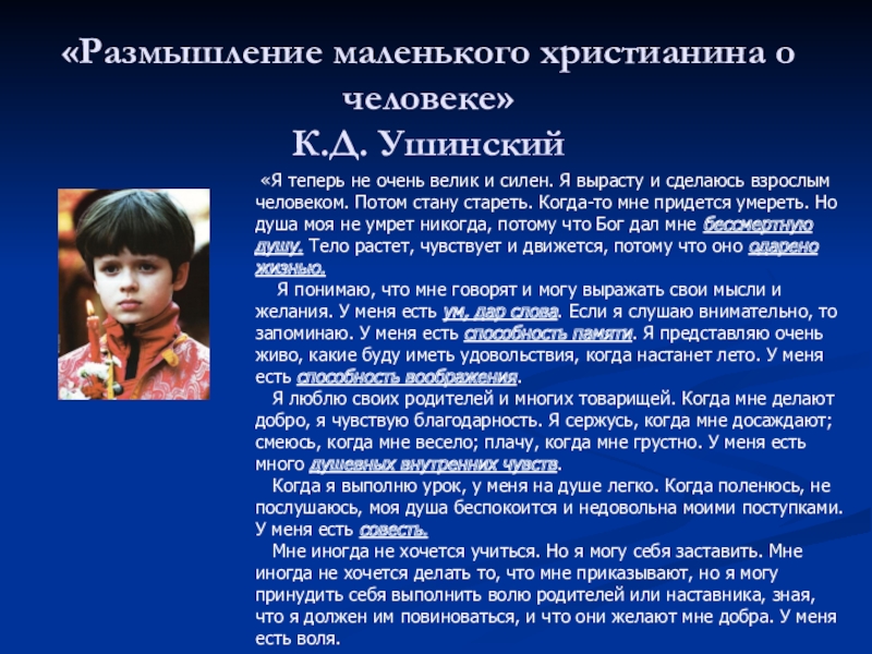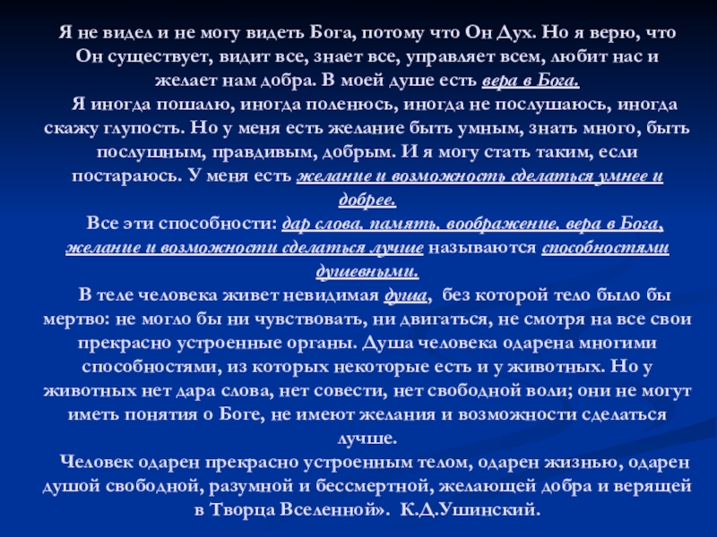 Человек одарен прекрасно устроенным телом, одарен жизнью, одарен душой свободной, разумной и бессмертной, желающей добра и верящей в Творца Вселенной». К.Д.Ушинский.