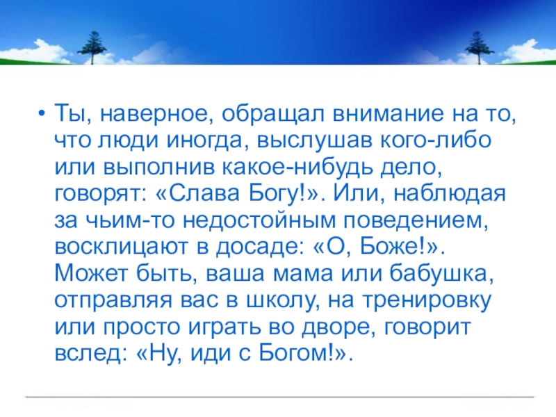 или выполнив какое-нибудь дело, говорят: «Слава Богу!». Или, наблюдая за чьим-то недостойным поведением, восклицают в досаде: «О, Боже!». Может быть, ваша мама или бабушка, отправляя вас в школу, на тренировку или просто играть во дворе, говорит вслед: «Ну, иди с Богом!».