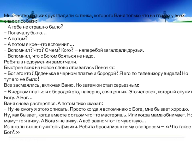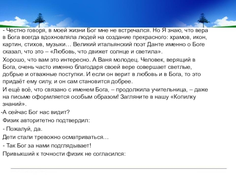 Слайд 10- Честно говоря, в моей жизни Бог мне не встречался. Но