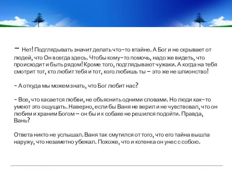 Слайд 11- Нет! Подглядывать значит делать что-то втайне. А Бог и не