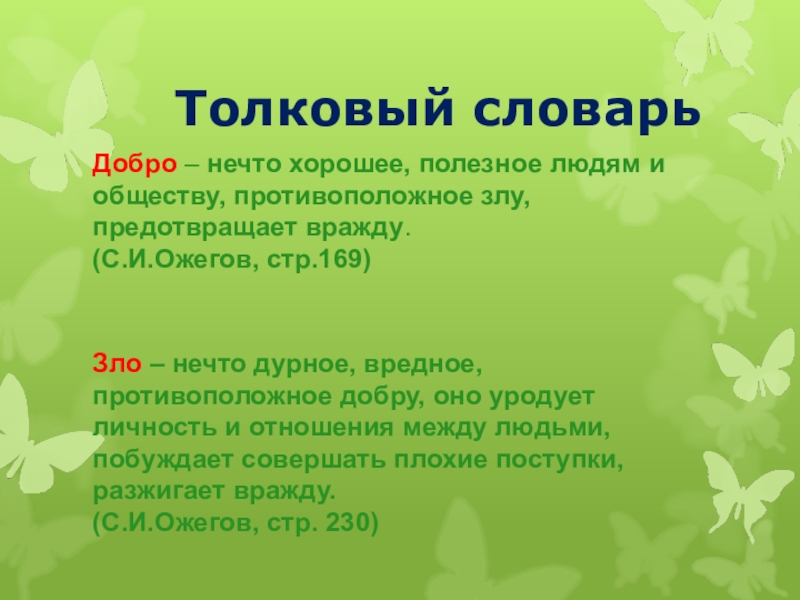 Зло – нечто дурное, вредное, противоположное добру, оно уродует личность и отношения между людьми, побуждает совершать плохие поступки, разжигает вражду.