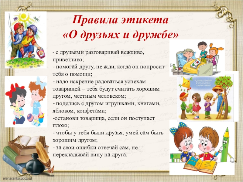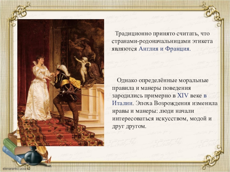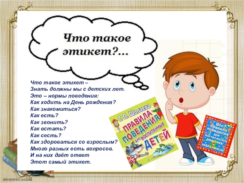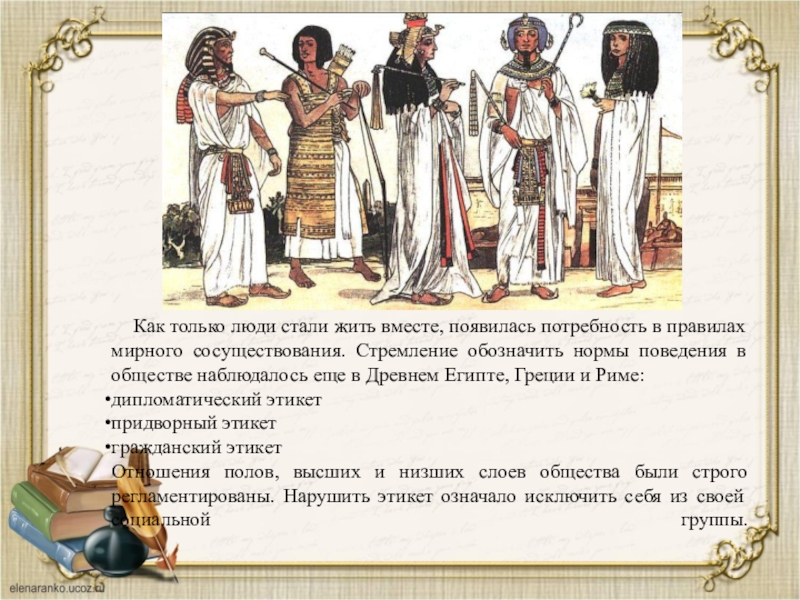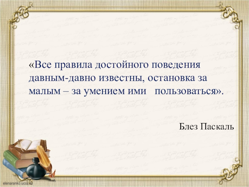 Правила этикета конкретны, ценны и доступны каждому. Знание этих правил не передается по наследству. Правилам этикета люди должны учиться.