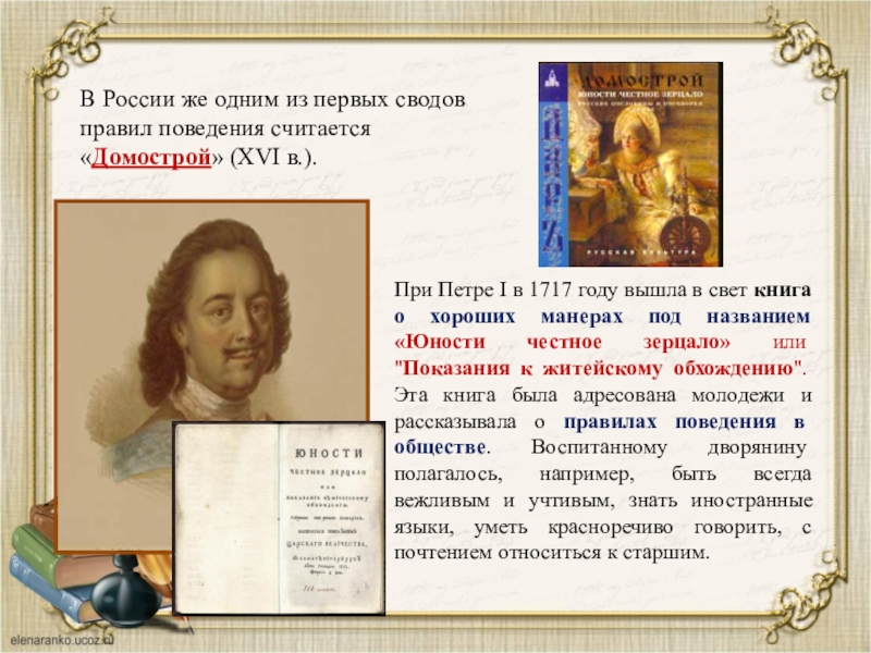 При Петре I в 1717 году вышла в свет книга о хороших манерах под названием «Юности честное зерцало» или "Показания к житейскому обхождению". Эта книга была адресована молодежи и рассказывала о правилах поведения в обществе. Воспитанному дворянину полагалось, например, быть всегда вежливым и учтивым, знать иностранные языки, уметь красноречиво говорить, с почтением относиться к старшим.