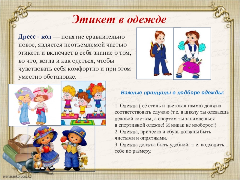 1. Одежда ( её стиль и цветовая гамма) должна соответствовать случаю (т.е. в школу ты одеваешь деловой костюм, а спортом ты занимаешься в спортивной одежде! И никак не наоборот!)