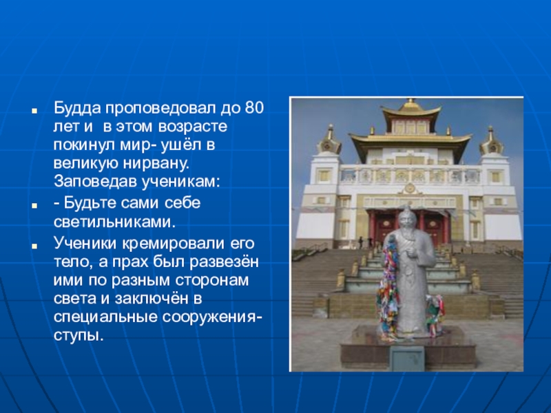 Будда проповедовал до 80 лет и в этом возрасте покинул мир- ушёл в великую нирвану. Заповедав ученикам:-