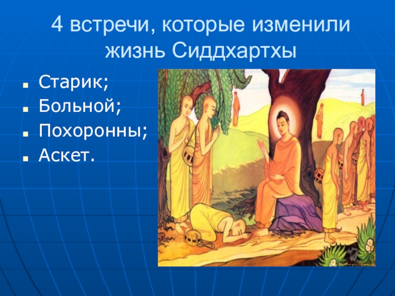4 встречи, которые изменили жизнь СиддхартхыСтарик;Больной;Похоронны;Аскет.