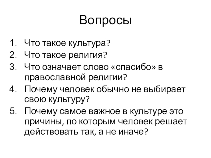 ВопросыЧто такое культура?Что такое религия?Что означает слово «спасибо» в православной религии?Почему человек обычно не выбирает свою культуру?Почему самое важное в культуре это причины, по которым человек решает действовать так, а не иначе?