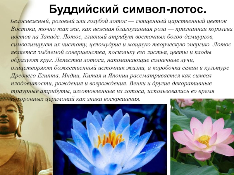 Слайд 8В буддизме лотос символизирует изначальные воды, духовное раскрытие, мудрость и нирвану. Лотос посвящен Будде,