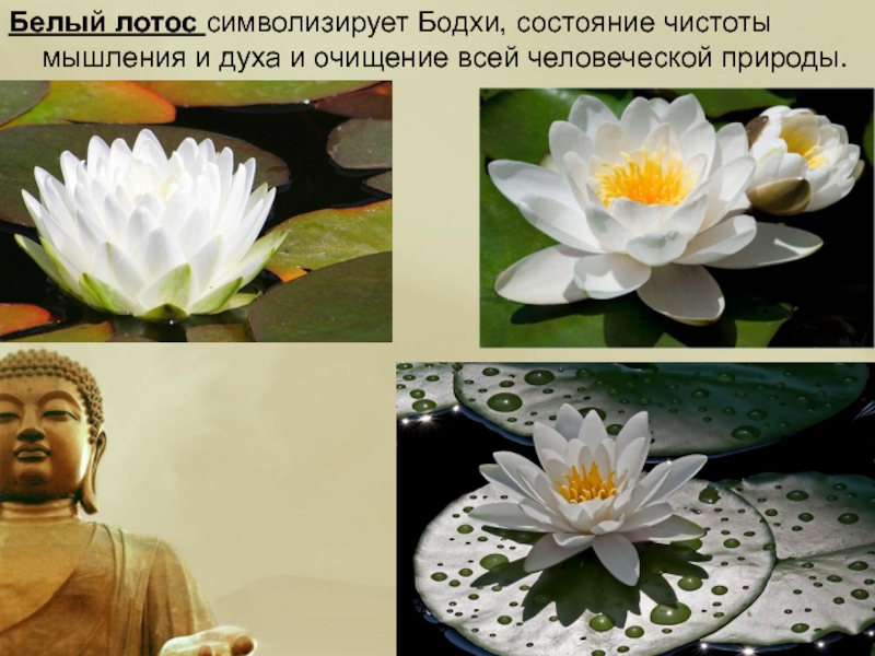 Слайд 10Белый лотос символизирует Бодхи, состояние чистоты мышления и духа и очищение