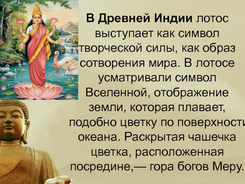 Слайд 7В Древней Индии лотос выступает как символ творческой силы, как образ сотворения мира.