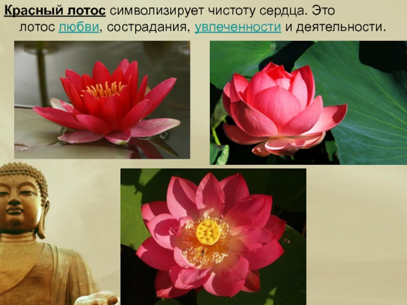 Слайд 11Красный лотос символизирует чистоту сердца. Это лотос любви, сострадания, увлеченности и деятельности.