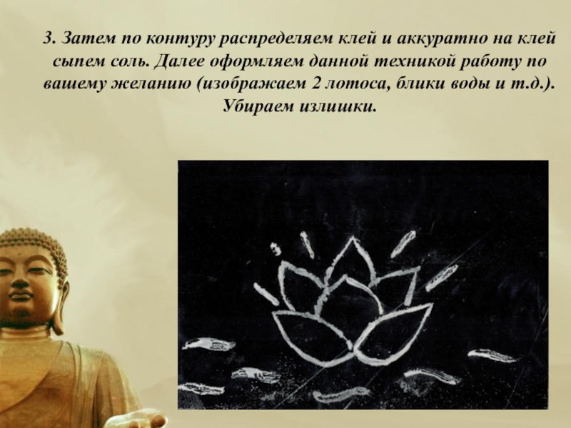соль. Далее оформляем данной техникой работу по вашему желанию (изображаем 2 лотоса, блики воды и т.д.). Убираем излишки.