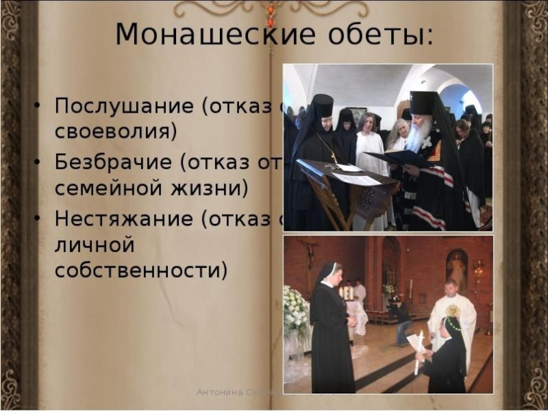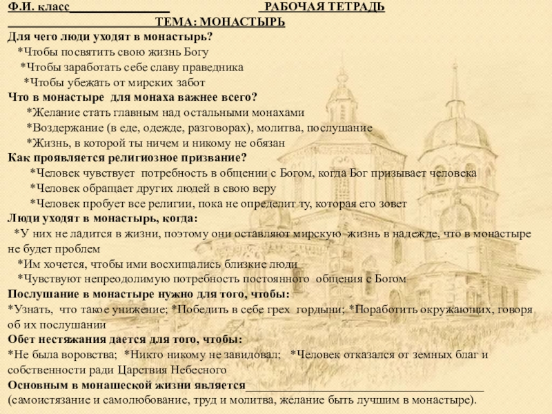 ТЕМА: МОНАСТЫРЬ Для чего люди уходят в монастырь? *Чтобы посвятить свою жизнь Богу *Чтобы заработать себе славу праведника *Чтобы убежать от мирских забот Что в монастыре для монаха важнее всего? *Желание стать главным над остальными монахами *Воздержание (в еде, одежде, разговорах), молитва, послушание *Жизнь, в которой ты ничем и никому не обязан Как проявляется религиозное призвание? *Человек чувствует потребность в общении с Богом, когда Бог призывает человека *Человек обращает других людей в свою веру *Человек пробует все религии, пока не определит ту, которая его зовет Люди уходят в монастырь, когда: *У них не ладится в жизни, поэтому они оставляют мирскую жизнь в надежде, что в монастыре не будет проблем *Им хочется, чтобы ими восхищались близкие люди *Чувствуют непреодолимую потребность постоянного общения с Богом Послушание в монастыре нужно для того, чтобы: *Узнать, что такое унижение; *Победить в себе грех гордыни; *Поработить окружающих, говоря об их послушании Обет нестяжания дается для того, чтобы: *Не была воровства; *Никто никому не завидовал; *Человек отказался от земных благ и собственности ради Царствия Небесного Основным в монашеской жизни является______________________________________ (самоистязание и самолюбование, труд и молитва, желание быть лучшим в монастыре).