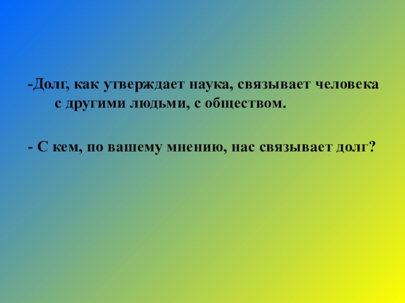 Слайд 10-Долг, как утверждает наука, связывает человека с другими людьми, с обществом.