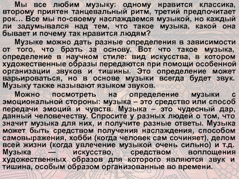 третий предпочитает рок… Все мы по-своему наслаждаемся музыкой, но каждый ли задумывался над тем, что такое музыка, какой она бывает и почему так нравится людям?