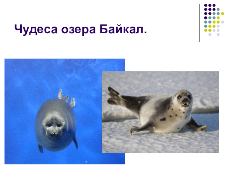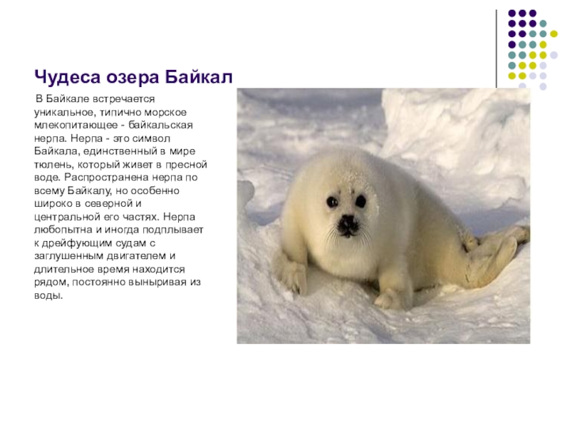 байкальская нерпа. Нерпа - это символ Байкала, единственный в мире тюлень, который живет в пресной воде. Распространена нерпа по всему Байкалу, но особенно широко в северной и центральной его частях. Нерпа любопытна и иногда подплывает к дрейфующим судам с заглушенным двигателем и длительное время находится рядом, постоянно выныривая из воды.