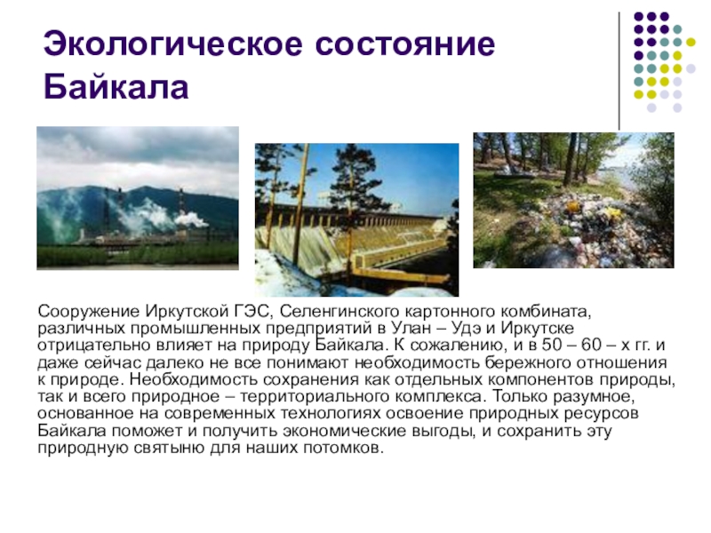 в Улан – Удэ и Иркутске отрицательно влияет на природу Байкала. К сожалению, и в 50 – 60 – х гг. и даже сейчас далеко не все понимают необходимость бережного отношения к природе. Необходимость сохранения как отдельных компонентов природы, так и всего природное – территориального комплекса. Только разумное, основанное на современных технологиях освоение природных ресурсов Байкала поможет и получить экономические выгоды, и сохранить эту природную святыню для наших потомков.