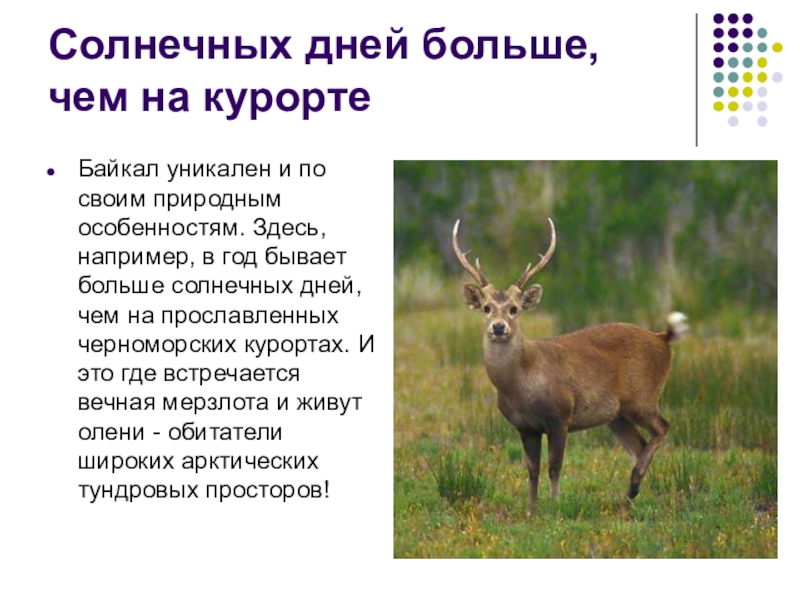 особенностям. Здесь, например, в год бывает больше солнечных дней, чем на прославленных черноморских курортах. И это где встречается вечная мерзлота и живут олени - обитатели широких арктических тундровых просторов!