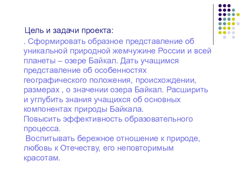 природной жемчужине России и всей планеты – озере Байкал. Дать учащимся представление об особенностях географического положения, происхождении, размерах , о значении озера Байкал. Расширить и углубить знания учащихся об основных компонентах природы Байкала.