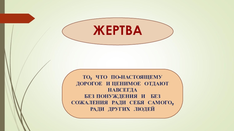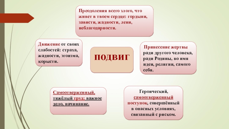 Принесение жертвы ради другого человека, ради Родины, во имя идеи, религии, самого себя.