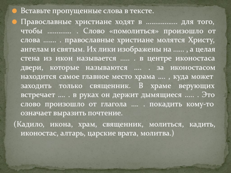 чтобы …………. . Слово «помолиться» произошло от слова ……. . православные христиане молятся Христу, ангелам и святым. Их лики изображены на …… , а целая стена из икон называется ….. . в центре иконостаса двери, которые называются …. . за иконостасом находится самое главное место храма …. , куда может заходить только священник. В храме верующих встречает …. . в руках он держит дымящиеся ….. . Это слово произошло от глагола …. . покадить кому-то означает выразить почтение.