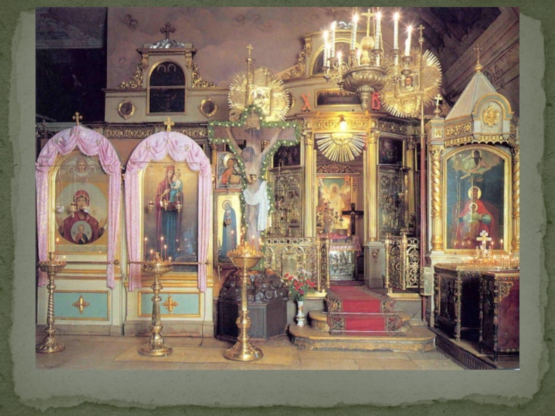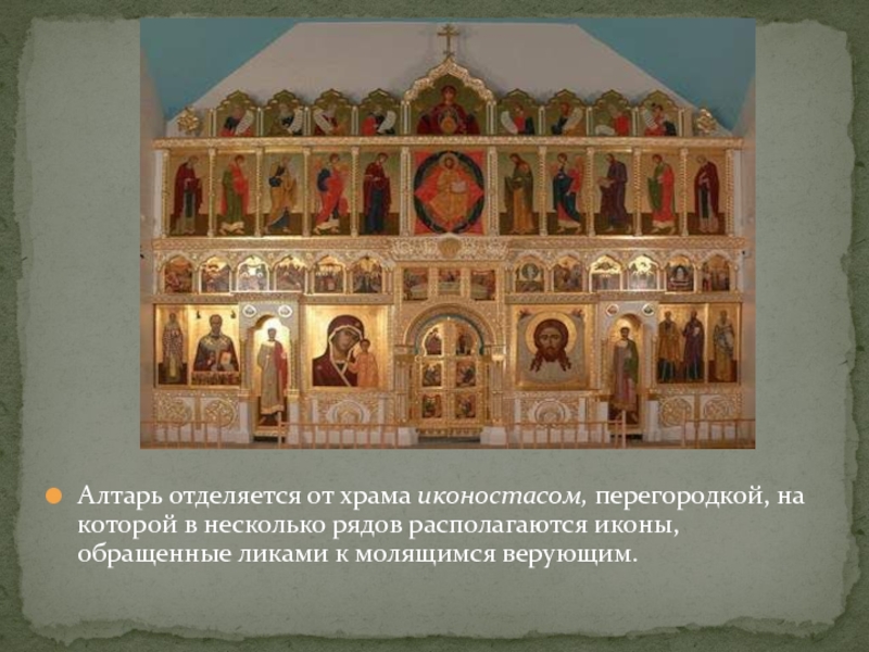 Слайд 15Алтарь отделяется от храма иконостасом, перегородкой, на которой в несколько рядов