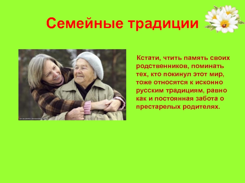 поминать тех, кто покинул этот мир, тоже относятся к исконно русским традициям, равно как и постоянная забота о престарелых родителях.
